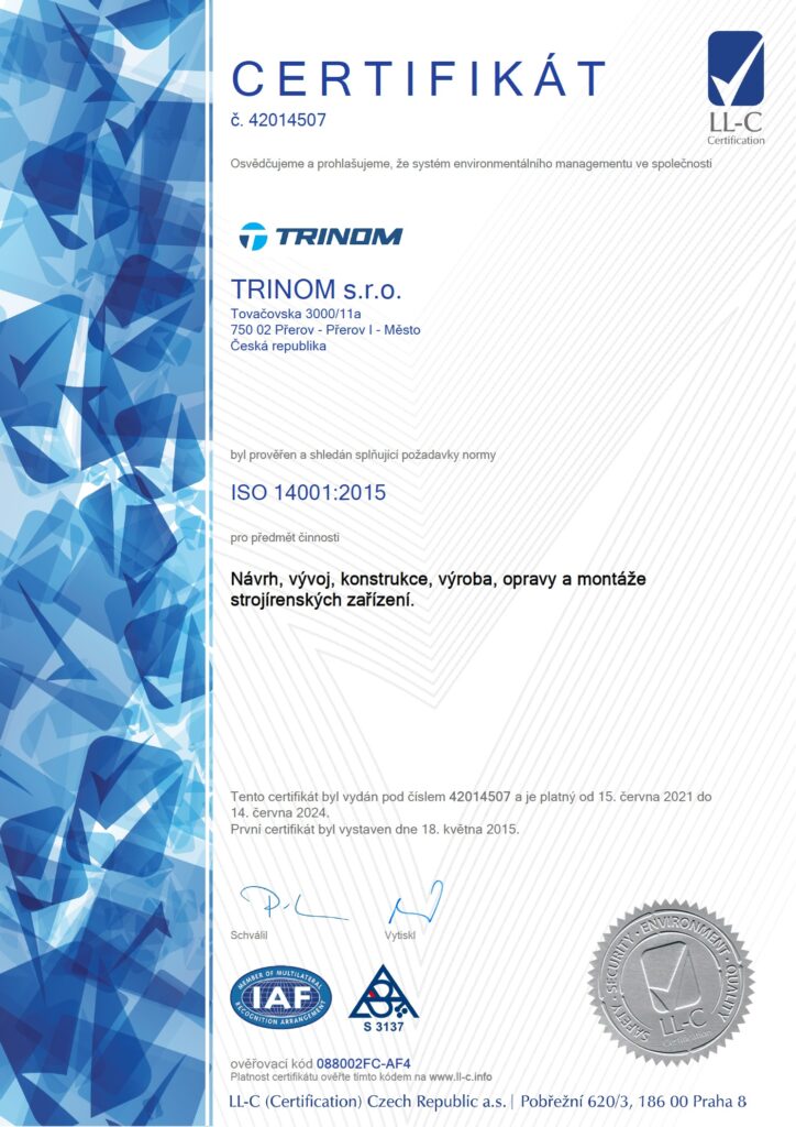 Společnost vyhlásila v roce 2015 svou politiku životního prostředí a úspěšně se certifikovala dle ISO 14001, systém environmentálního managementu.