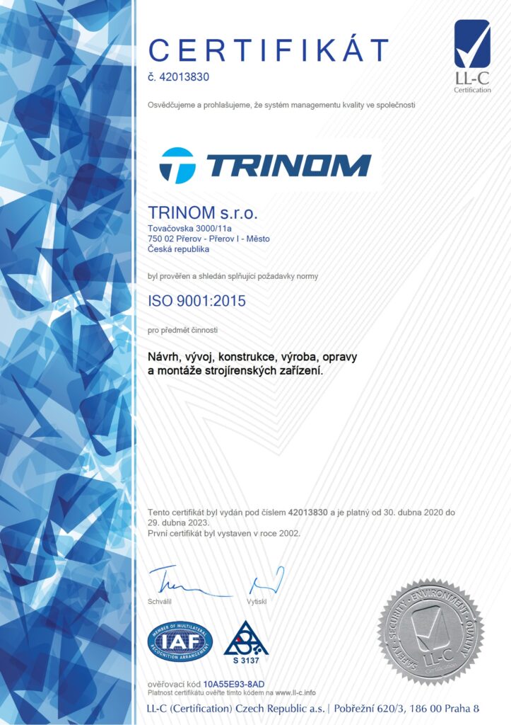Pro zajištění kvality výrobků a služeb zavedla společnost v roce 2002 systém jakost ISO 9001.